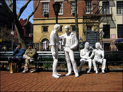 It's not a park in the "normal" sense of the word, but it's a park, nonetheless, carved out as it is in a space on the corner of 7th Avenue South, West 4th, Christopher Street, and probably a couple of others that I failed to notice. (As I mentioned, this area lacks logic.) The park is lined with benches and trees, and there are four sculptures that are both frightening and soothing. I say frightening, because they're a little too animated; it was also dark, and Halloween is next week, and, well, that's that. I say soothing, because the four sculptures are actually two same-sex couples. The men are standing; the women are sitting.